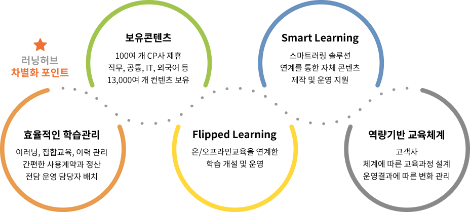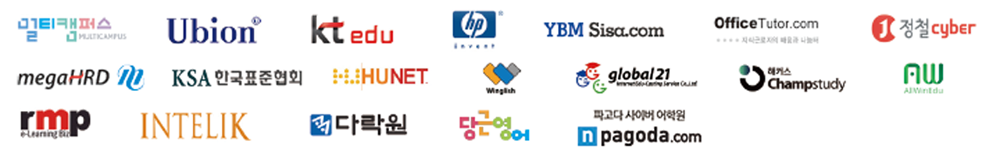 교육 통합 연수원:On-Off Line 교육통합관리를 통한 최적의 교육운영 관리 시스템 다양한 콘텐츠:E-Learning 전화어학, 플립러닝, 집합교육 모바일 등 분야/형태별 콘텐츠 서비스 고객사 맞춤형 연수원:기업에서 필요로 하는 교육, 지식 정보 등 맞춤형 역량 개발 및 성과지향형 시스템